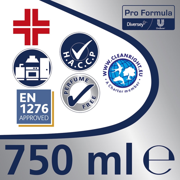 Dezinfectarea fără parfum face ca produsul să fie ideal pentru zonele unde mâncarea este preparată. Produsul este eficient împotriva unei game variate de micro-organisme. Înlătură grăsimea și resturile alimentare uscate cu ușurință. Test EN 1276 acreditat, contact de 30 de secunde pe suprafață.