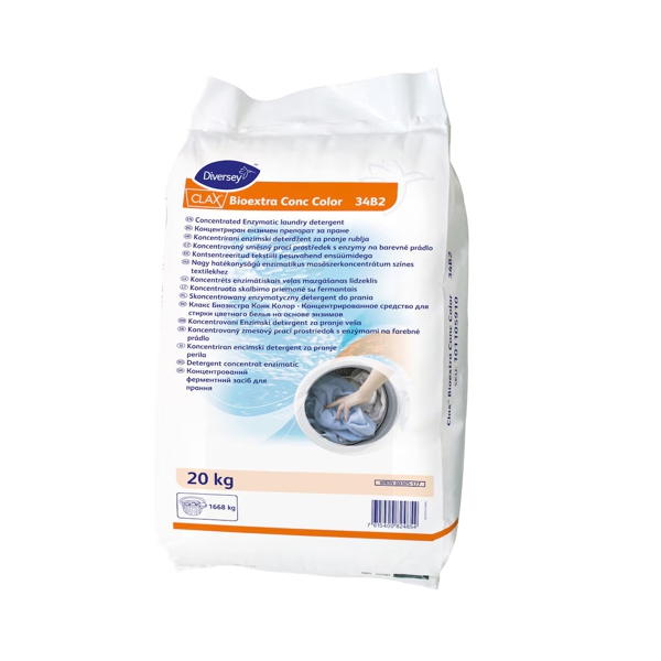 Clax Bioextra Conc Color este un detergent pulbere enzimatic fără fosfați, destinat utilizării în spălătorii profesionale și spălătorii interne, care asigură o eficacitate excelentă de curățare și spălare. Clax BioExtra Conc Color a fost dezvoltat special pentru dozare manuală pentru toate țesăturile colorate din bumbac și amestec de poliester și bumbac la temperaturi scăzute până la medii, în mod ideal la 40 °C, la cele mai frecvente niveluri de duritate a apei.
