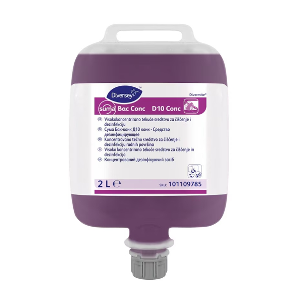 Suma Bac conc D10-conc este un detergent dezinfectant foarte concentrat pentru igienizarea într-un singur pas a oricăror suprafeţe din zonele de producţie alimentară, de exemplu zonele de preparare a alimentelor şi a celor frigorifice. De asemenea, disponibil în pouch complet reciclabil dintr-un singur material.