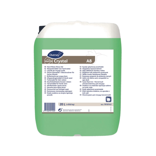 Suma Crystal A8 este un aditiv de clătire acid concentrat. Acesta a fost conceput special pentru utilizarea cu o gamă largă de mașini de spălat. Produsul conține un amestec de surfactanți cu spumare redusă pentru uscare rapidă și fără urme și pentru controlul formării de spumă în mașina de spălat vase. Acesta conține, de asemenea, agenți de control a depunerilor de piatră, pentru a menține mașina într-o stare bună, în condiții de apă cu duritate medie și mare. Un ingredient special încorporat face ca produsul să fie adecvat pentru utilizarea pe metale moi.