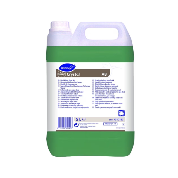 Suma Crystal A8 este un aditiv de clătire acid concentrat. Acesta a fost conceput special pentru utilizarea cu o gamă largă de mașini de spălat. Produsul conține un amestec de surfactanți cu spumare redusă pentru uscare rapidă și fără urme și pentru controlul formării de spumă în mașina de spălat vase. Acesta conține, de asemenea, agenți de control a depunerilor de piatră, pentru a menține mașina într-o stare bună, în condiții de apă cu duritate medie și mare. Un ingredient special încorporat face ca produsul să fie adecvat pentru utilizarea pe metale moi.