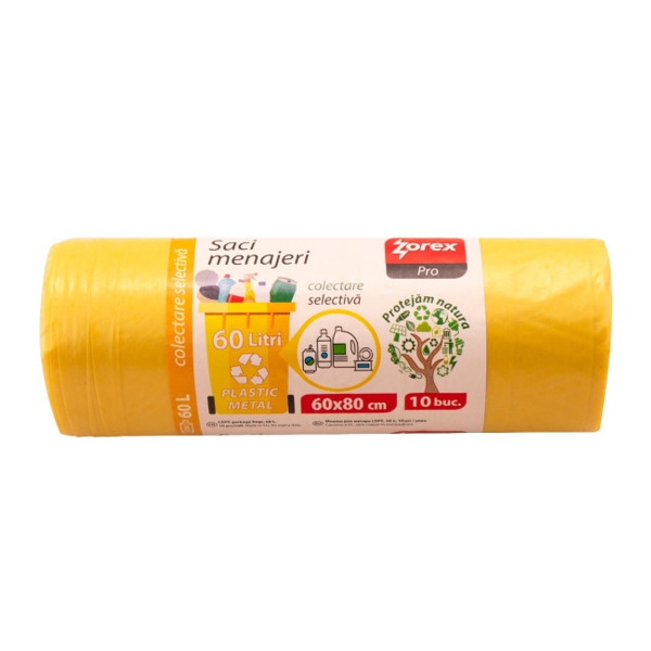 Saci colectare selectiva Zorex-Plastic/Metal, 60L, galben, 10 buc / rola sunt utili pentru gestionarea deseurilor reciclabile din plastic si metal. Acesti saci sunt de tip galben, ceea ce ii face ideali pentru reciclarea corecta a acestor materiale. Cu o capacitate de 60L, sacii sunt potriviti pentru utilizarea atat in spatiile industriale, cat si in cele domestice. Fiecare rola contine 10 saci rezistenti si durabili, fabricati dintr-un material polietilena de inalta densitate ce ofera protectie impotriva scurgerilor sau ruperii.
